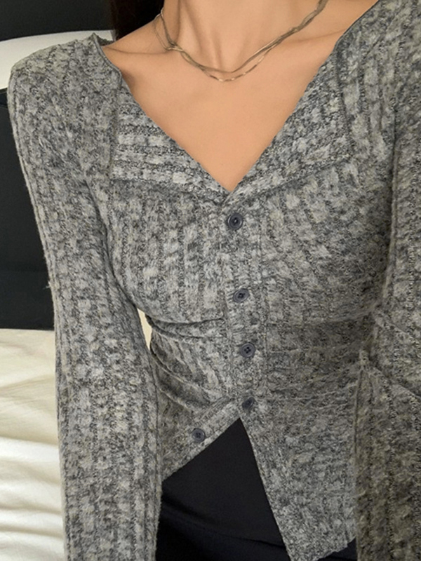Ribbed V Neck Slim Long Sleeve Knit