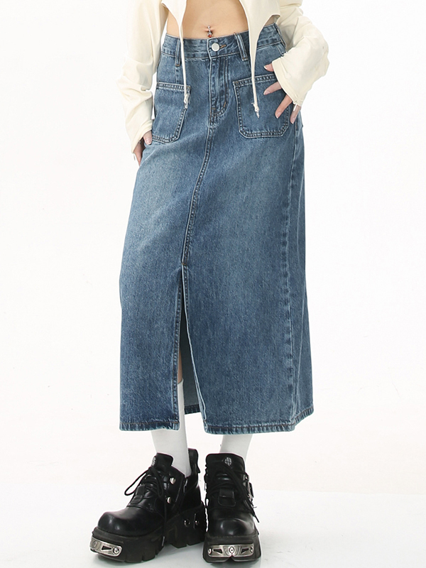 Vintage Pocket Front Slit Denim Midi Skirt