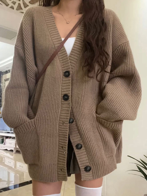 Preppy Solid Color V Neck Baggy Cardigan