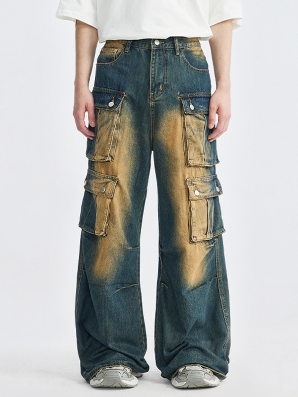 Retro Washed Distressed Multiple Pockets Cargo Jeans