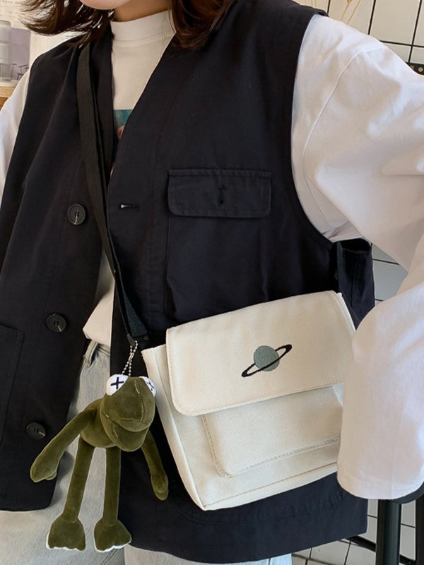 Design: With a cartoon pendant, adjustable shoulder strapsStyle, features planet embroidered and zip fly closure design.