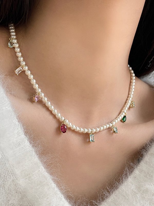 Zircon Pendant Faux Pearl Necklace
