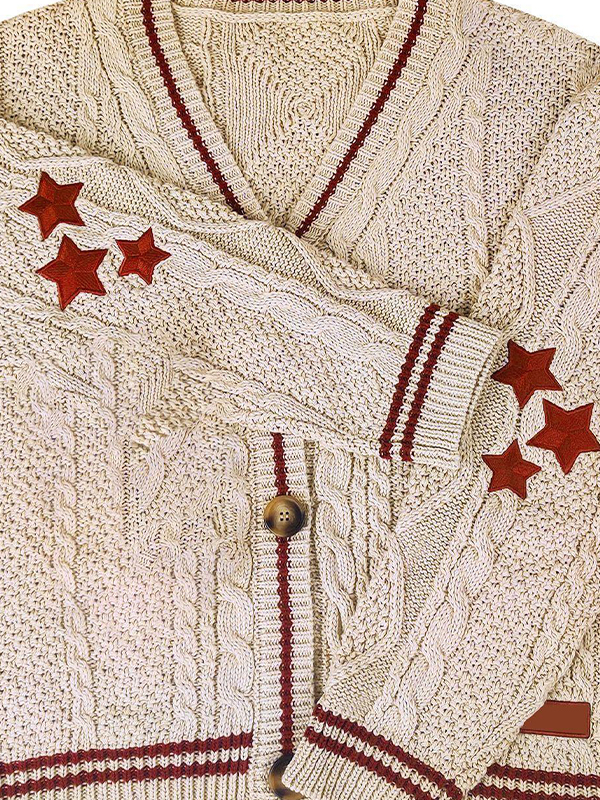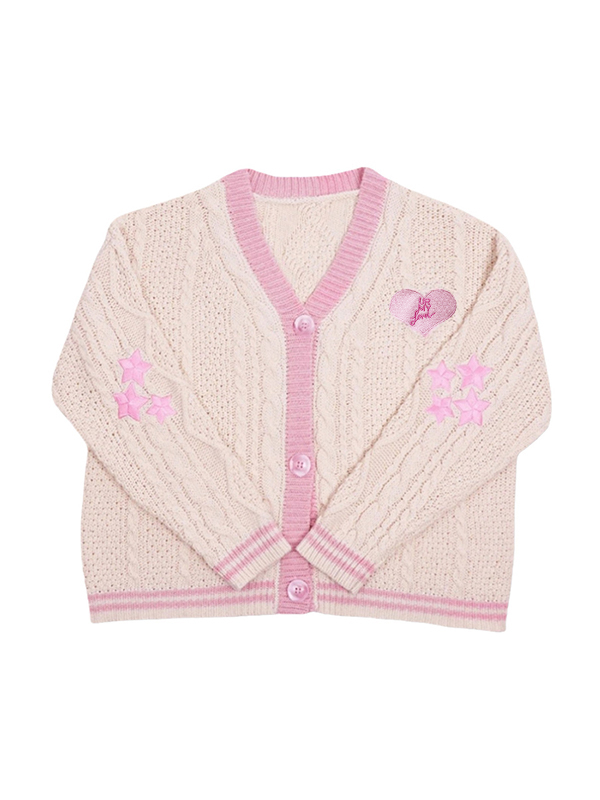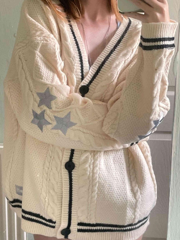 Contrast Trim Star Embroidery V Neck Cardigan