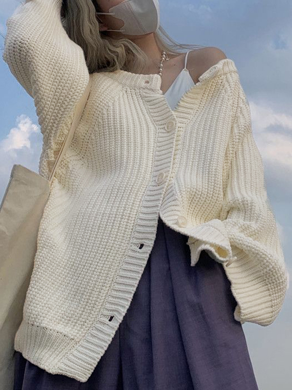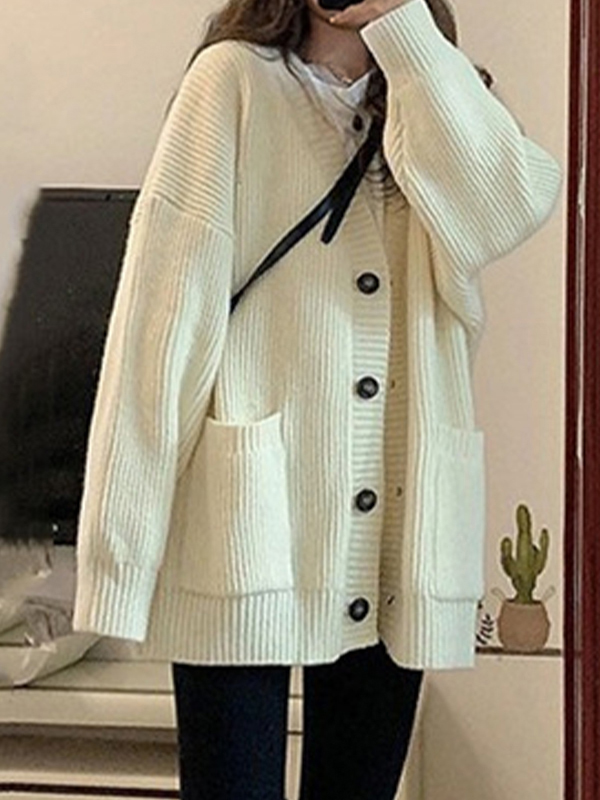 Preppy Solid Color V Neck Baggy Cardigan