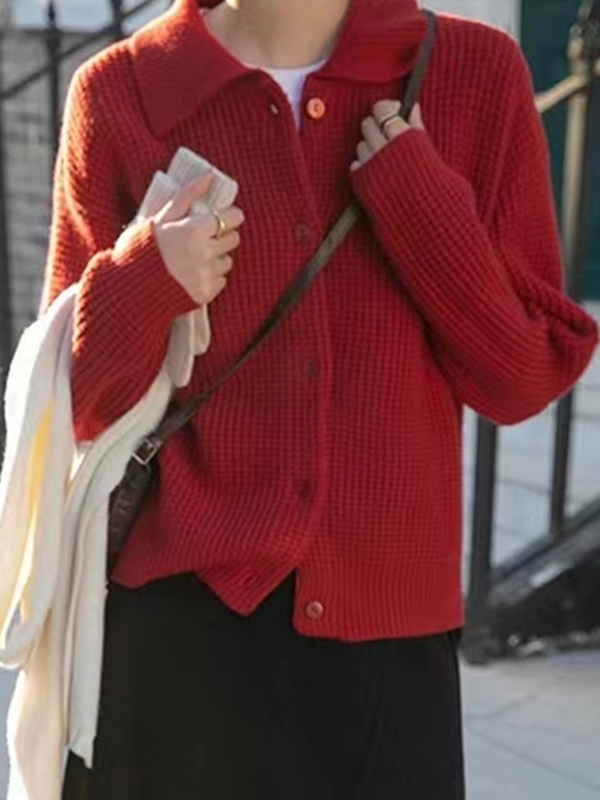 Solid Waffle Lapel Neck Cardigan