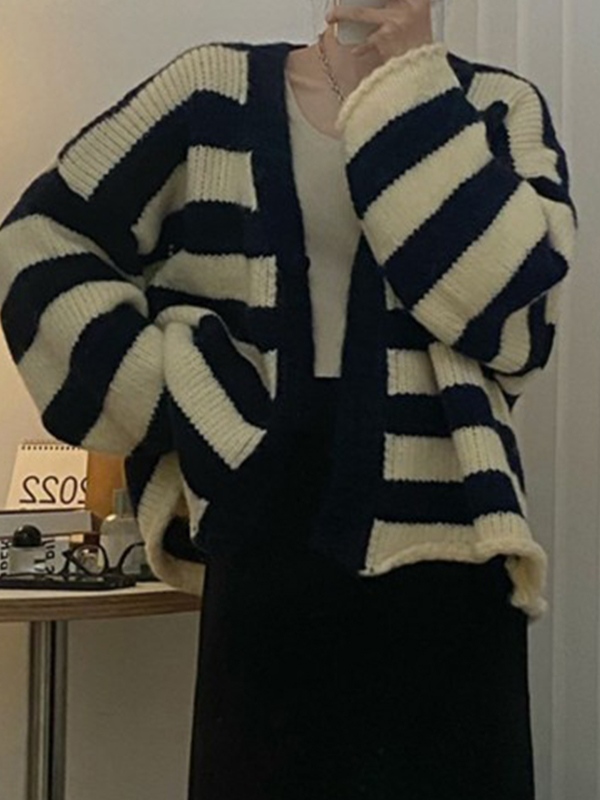 Contrast Color Striped V Neck Rolled Loose Knit Cardigan