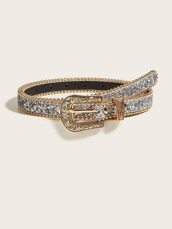 Sequin Carved Buckle Skinny Belt